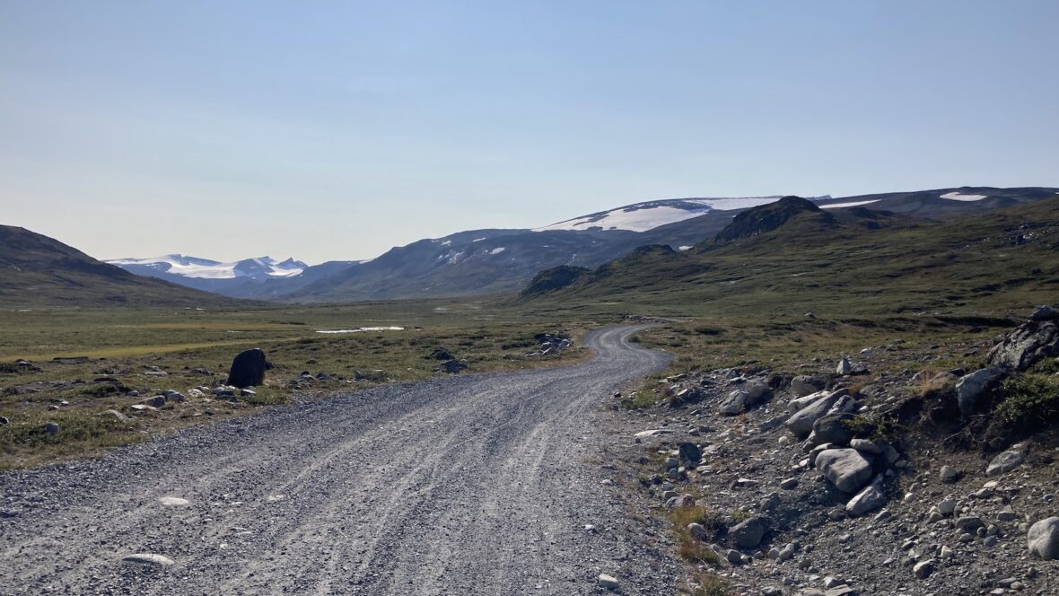 Der Weg führt mich weiter nach Jotunheimen rein und steigt auch plötzlich an. Ich bin in den Bergen unterwegs. Der Weg führt bis zu einer Hütte, von der aus nur noch mit Fahrrad oder zu Fuß in die Bergwelt reingeht.