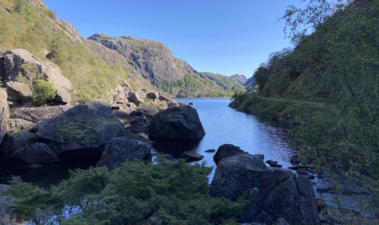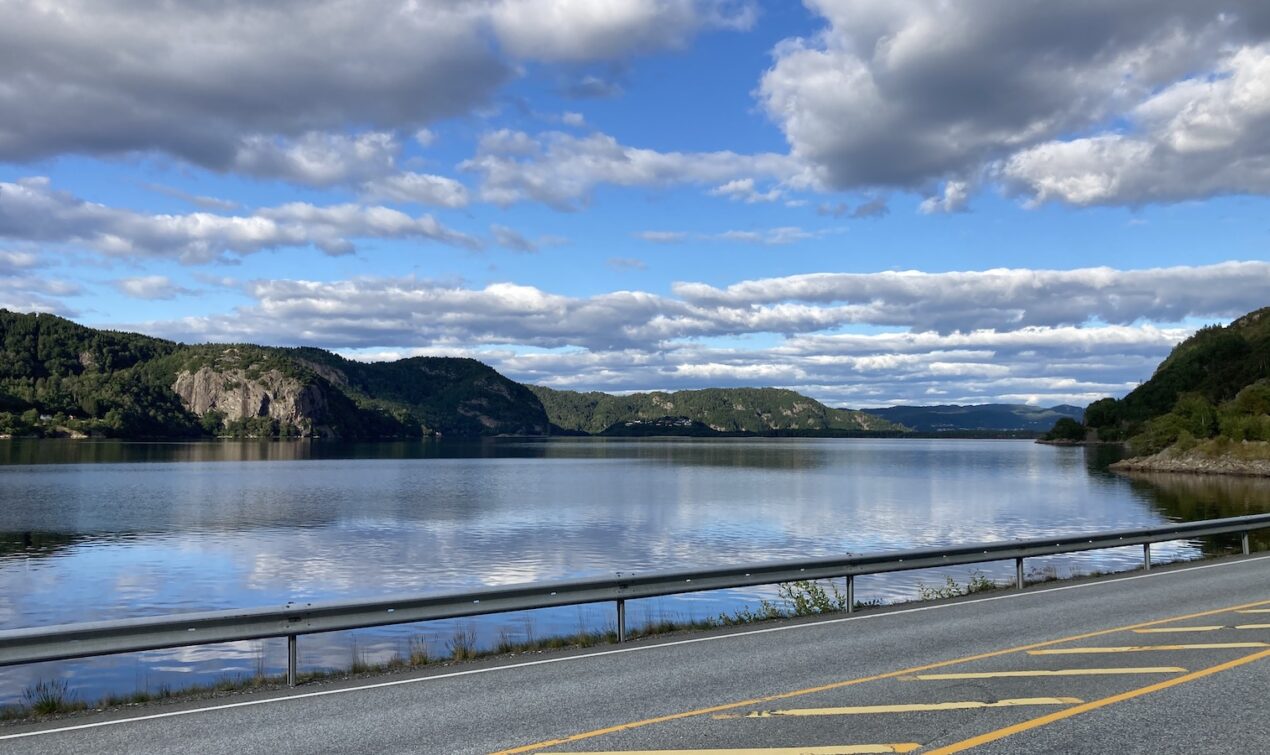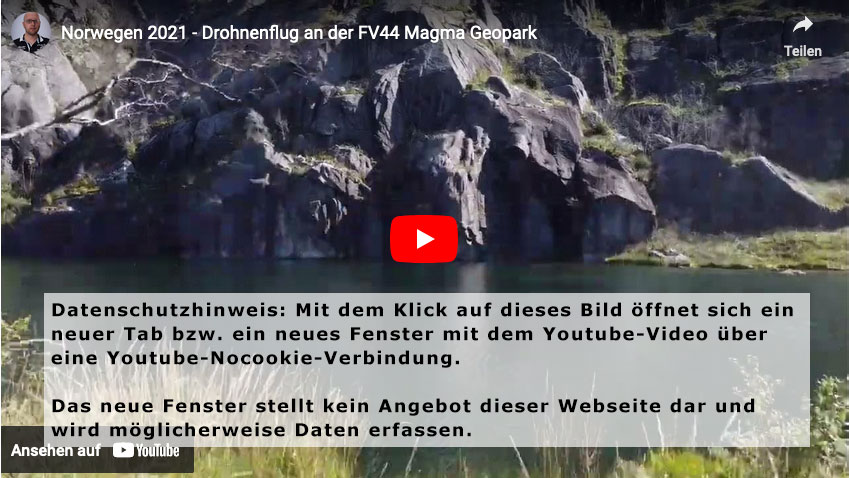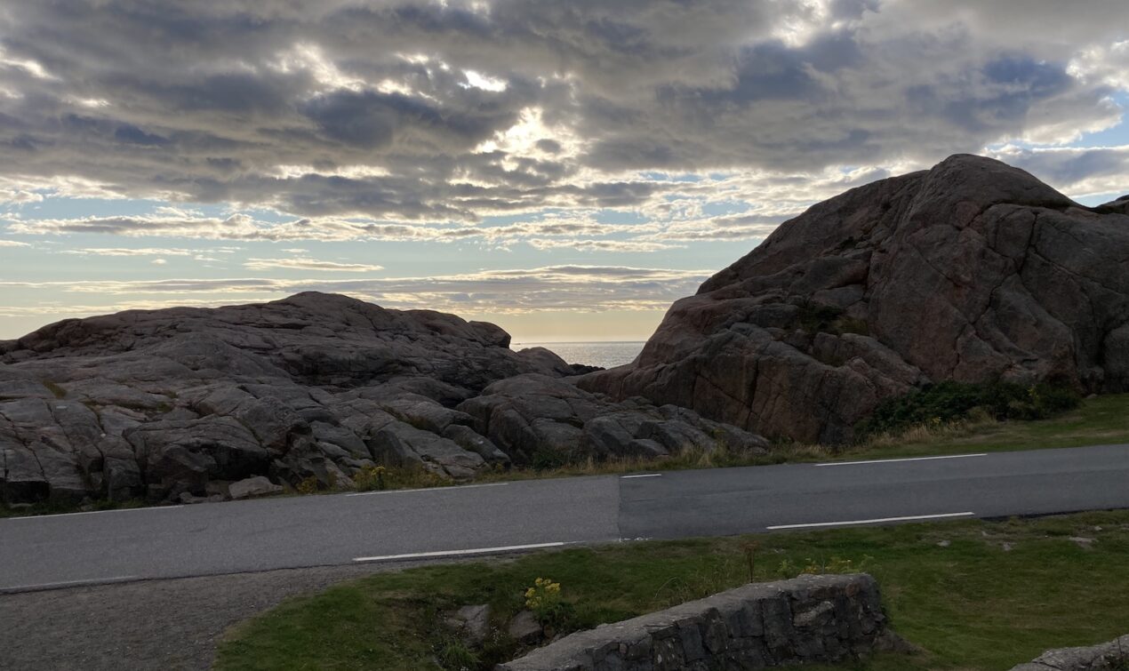 Vom Campingplatz aus folge ich weiter der FV44 an der Küste entlang. Die Route bis Flekkefjord beeindruckt mich wieder, aber die Strecke ist deutlich kürzer und nicht so aufregend zu fahren, wie ich es in Erinnerung habe. Die Strasse ist nur an einigen Stellen wirklich eng, aber es ist schön und ich geniesse die Tour bei diesmal deutlich besserem Wetter. Kurz vor Flekkefjord fährt man durch den Magma Geopark: