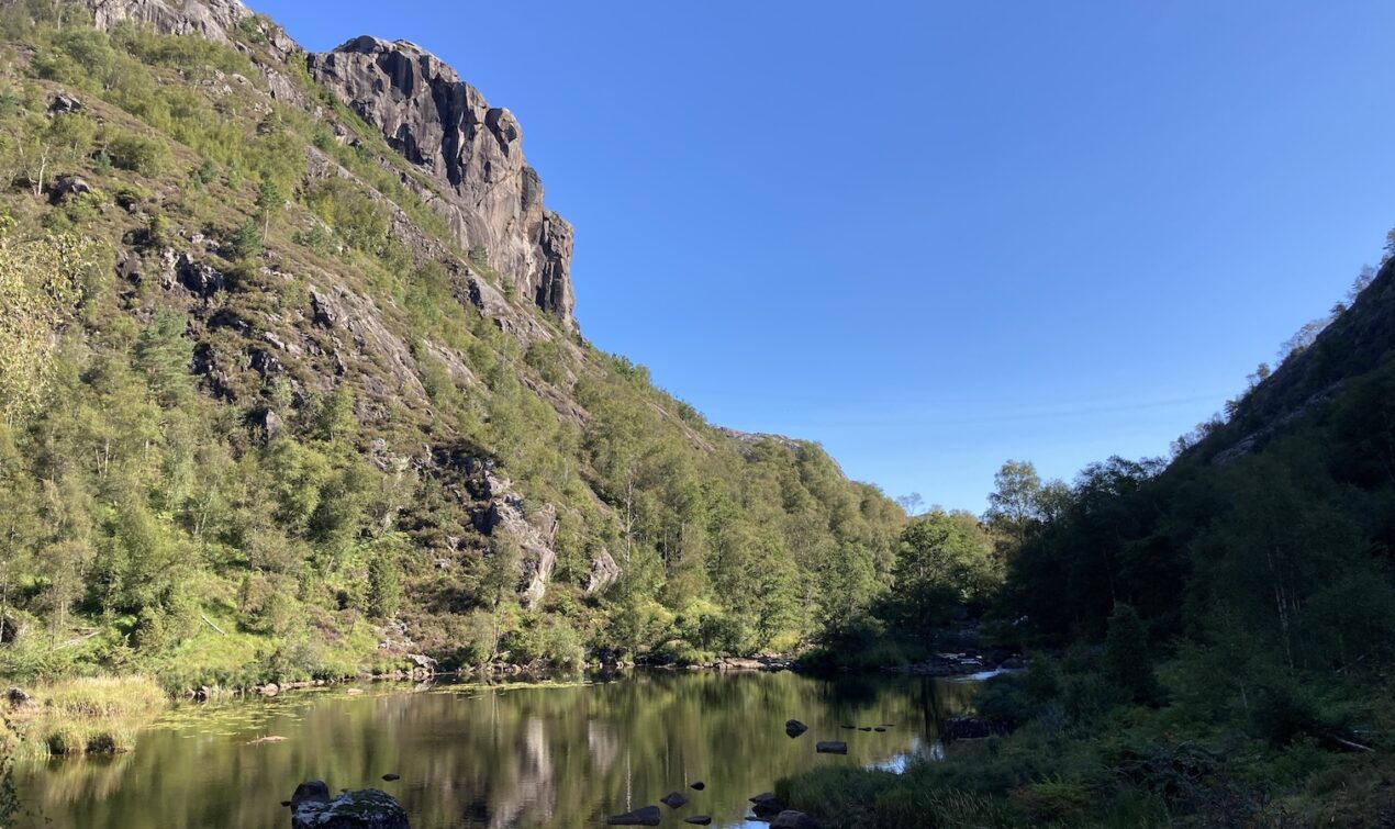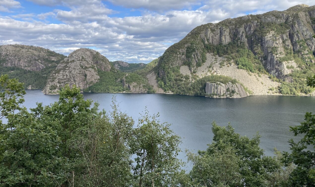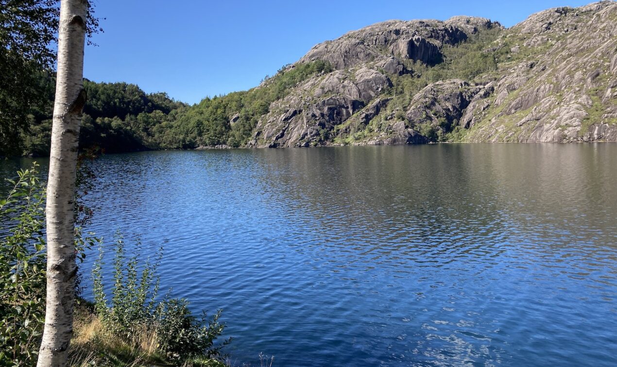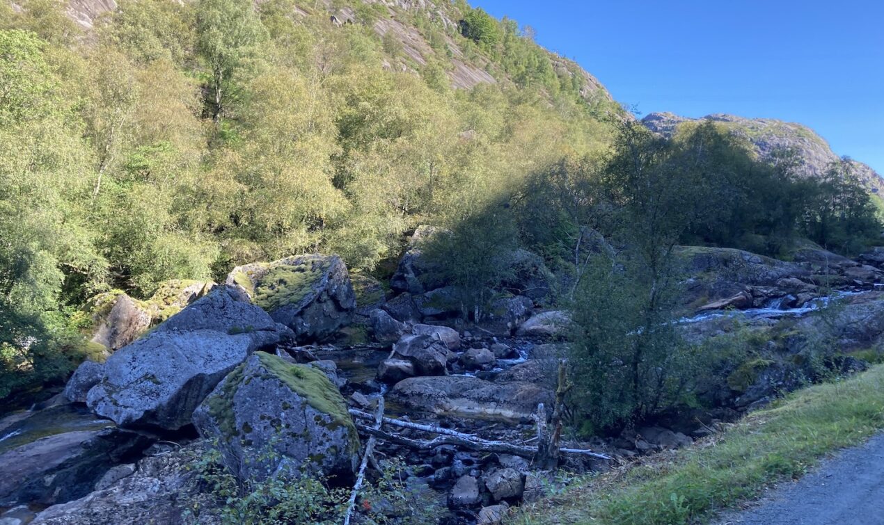 Vom Campingplatz aus folge ich weiter der FV44 an der Küste entlang. Die Route bis Flekkefjord beeindruckt mich wieder, aber die Strecke ist deutlich kürzer und nicht so aufregend zu fahren, wie ich es in Erinnerung habe. Die Strasse ist nur an einigen Stellen wirklich eng, aber es ist schön und ich geniesse die Tour bei diesmal deutlich besserem Wetter. Kurz vor Flekkefjord fährt man durch den Magma Geopark: