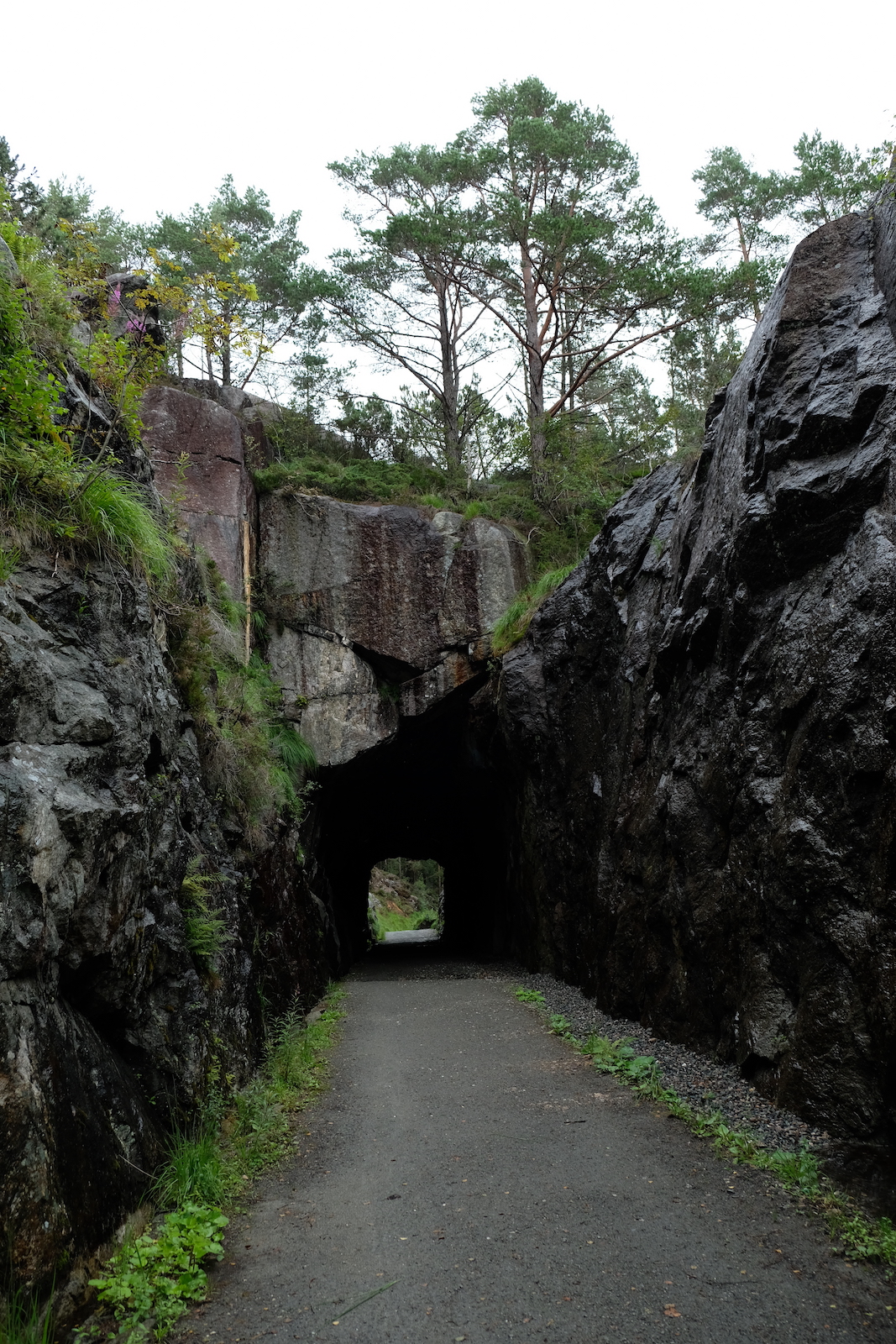 Während des Tages regnet es immer wieder. Das Wetter verfolgt mich Woche, aber die Landschaft lohnt sich trotzdem. Kurz hinter Flekkefjord führt die Strecke durch eigentümlich anmutende Fjelllandschaften. Immer wieder sind Norwegen Sehenswürdigkeiten an der Strasse mit braunen Hinweisschildern ausgezeichnet. Einem der Schilder folge ich zu einem stillgelegten Abschnitt der Malmbane. Einer einspurigen Bahnstrecke. Diese ist inzwischen zu einem Wanderweg umgebaut worden. Das Beitragsbild oben ist der Malmbanetunnel.